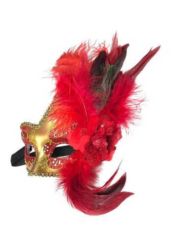 Red and gold Mardi Gras Masquerade Mask. Red and peacock feathers and black silk ribbon ties. 6" wide, 12" tall. Each of these handmade masks are a little different.